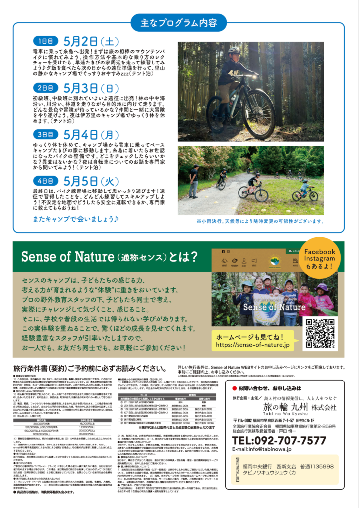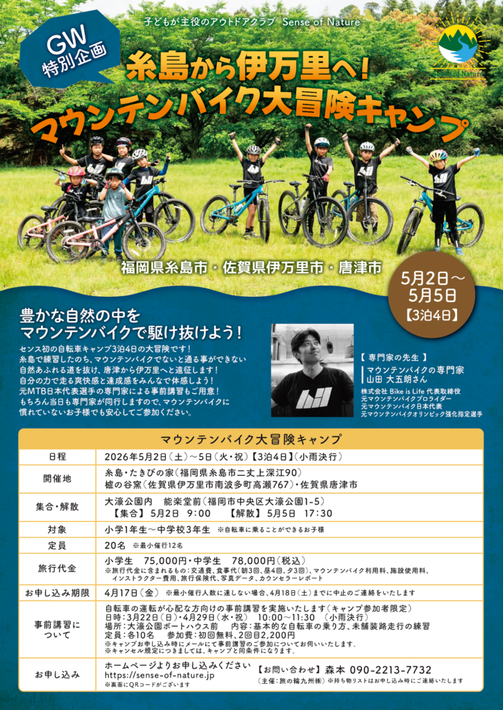 一般社団法人センスオブネイチャーさんの企画で、自転車キャンプ🚲3泊4日の大冒険を開催します!